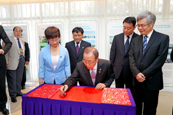 潘基文表示,國(guó)際小水電中心是中國(guó)與聯(lián)合國(guó)開展南南合作的典范,是習(xí)近平主席倡導(dǎo)和支持的南南合作的杰出代表。潘基文為國(guó)際小水電中心題詞:“Small hydropower is an important renewable energy. I hope the International Center on Small Hydro Power (ICSHP) continues to make great contributions to the development of small hydropower worldwide.”