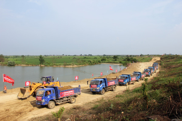 受前期連續(xù)強降雨及長江洪水倒灌、頂托影響,九江市河湖水位長時間處于超警戒水位狀態(tài),導致該地區(qū)防汛形勢十分嚴峻,圩堤險情隨時可能發(fā)生,特別是堤腳處有池塘的圩堤更易出現(xiàn)險情。為確保廬山市沙湖山圩堤長期穩(wěn)固,我司在接到該市防汛指揮部的除險加固任務后,立即派遣抗洪搶險突擊隊前往現(xiàn)場進行搶險,以穩(wěn)固圩堤,確保圩堤內(nèi)村莊百姓及農(nóng)田安全。經(jīng)過現(xiàn)場勘查,突擊隊決定沿著圩堤腳有池塘的地段填出一條長約1公里、寬20米的壓浸平臺進行加固處理。搶險方案確定后,公司迅速組織了3臺挖掘機、2臺裝載機、36臺自卸汽車等機械設備及40多名作業(yè)人員頂著炎炎烈日進行施工,力求在10天內(nèi)完成搶險任務,確保圩堤安全。