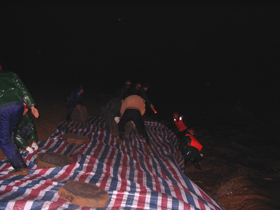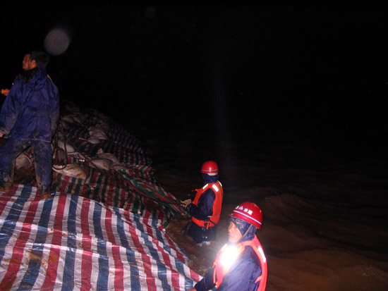 根據(jù)以往的施工經(jīng)驗(yàn),我們很快啟動(dòng)了搶險(xiǎn)應(yīng)急預(yù)案。但由于環(huán)境惡劣,考驗(yàn)我們的時(shí)候到了,要發(fā)揚(yáng)我們江西水建人“特別能吃苦、特別能戰(zhàn)斗、特別能忍耐、特別能協(xié)作精神”的時(shí)候到了,我們與洪水搶時(shí)間、爭進(jìn)度,全體干群在漆黑的大堤上是一片穿梭奔跑的身影,大家齊心協(xié)力,手提肩扛,把一百多斤一塊的混凝土預(yù)制塊,一塊塊運(yùn)到堤腳,此時(shí)項(xiàng)目部總工曾俊平不顧江水的寒冷,帶領(lǐng)其它幾名員工,奮身躍入水中,在水下鋪設(shè)彩條布,而此時(shí)水下溫度只有10℃左右,渾濁江水一浪高過一浪拍打在他們的身上。大家顧不上寒冷,顧不上疲勞,顧不上饑餓,衣服濕了又干,干了又濕,分不清是哪次被汗水還是雨水弄濕的,在微弱的手電光照亮下鋪設(shè)了一條又一條彩布條,碼起了一道又一道沙包小堤。經(jīng)過大家的緊張奮戰(zhàn),終于幾處險(xiǎn)情得到了控制,等到我們?cè)诿β抵谢剡^神來時(shí),已經(jīng)是次日的凌晨三點(diǎn)多鐘,盡管大家拖著一副疲憊不堪的泥身子,但大家臉上裝滿了滿意和勝利的微笑,王總此時(shí)飽含真情地對(duì)大家說了一聲:“大家真的辛苦了,謝謝大家!”走在回家的路上,我正好與項(xiàng)目總工曾俊平走在一起,我看到他渾身濕漉漉的,我關(guān)心的問他在水中冷嗎?他笑笑說道:“這是關(guān)鍵時(shí)刻,再冷也要下”。他旁邊的同事告訴我,他是從下午三點(diǎn)鐘就一直在水里做事直到剛才,整整在水中浸泡了十二個(gè)小時(shí)。我們參加搶險(xiǎn)的同志被曾俊平這種不怕困難、不畏艱險(xiǎn)、不顧個(gè)人安危、敢于吃苦的精神深深感動(dòng)著,真是我們學(xué)習(xí)的好榜樣!
