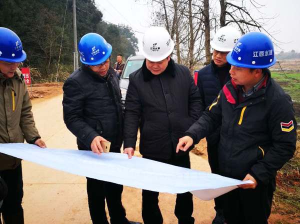 1月31日,董事長(zhǎng)王元旦率總經(jīng)理徐洪良、書(shū)記王延軍、工會(huì)主席史偉、董事會(huì)秘書(shū)劉俊視察廖坊灌區(qū)二期工程PPP項(xiàng)目。