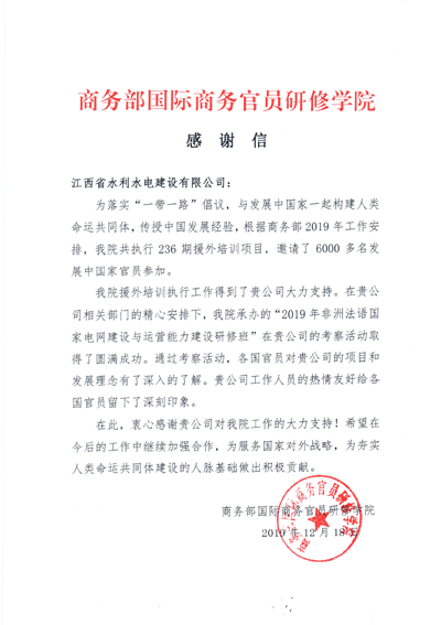 人力資源2019年,公司圍繞國(guó)家和我省“走出去”戰(zhàn)略,積極配合商務(wù)部及省內(nèi)援外培訓(xùn)工作,得到各方認(rèn)可。近日,公司收到來(lái)自商務(wù)部國(guó)際商務(wù)官員研修學(xué)院的感謝信,信中提到,商務(wù)部研修學(xué)院援外培訓(xùn)工作得到我公司的大力支持,“2019年非洲法語(yǔ)國(guó)家電網(wǎng)建設(shè)與運(yùn)營(yíng)能力建設(shè)研修班”考察、交流活動(dòng)取得圓滿(mǎn)成功,對(duì)公司的積極配合表示衷心感謝。