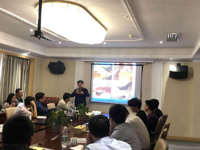 現(xiàn)場(chǎng)參觀結(jié)束后,學(xué)習(xí)團(tuán)參加了技術(shù)培訓(xùn)和經(jīng)驗(yàn)交流會(huì)??偨?jīng)理助理杜凌主持了開(kāi)班儀式??偣こ處熀櫥?、項(xiàng)目副經(jīng)理李成,對(duì)洋前壩水庫(kù)的大壩總布置、大壩施工導(dǎo)流、大壩及供水管道施工技術(shù)細(xì)節(jié)等,通過(guò)文字、圖片、視頻等組成的PPT課件為學(xué)員授課,并就學(xué)員提出的問(wèn)題逐一進(jìn)行了解答。