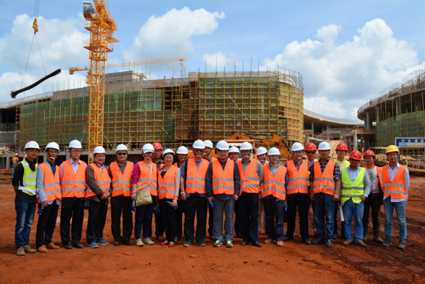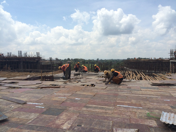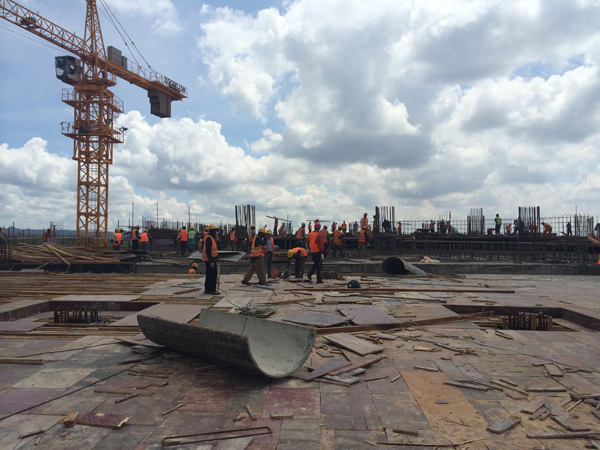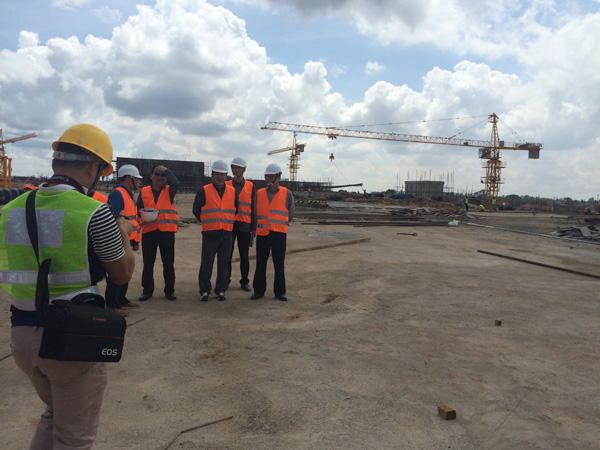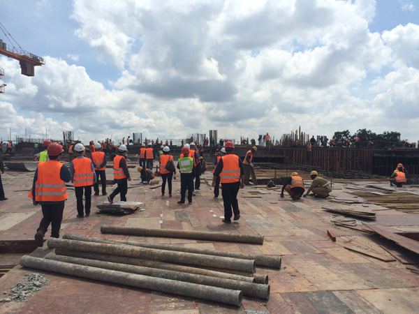 “雙河”項目是一個集零售商場、現(xiàn)代辦公樓、公共娛樂以及配套設施的綜合性工程,作為東非最大的在建城市綜合體,總建筑面積為18.2萬平方米,單層面積就超過四萬多平米。雖然出國前我對“雙河”項目就有一定的了解,但親臨現(xiàn)場,感受工地的壯觀,內心仍然受到巨大的震撼。這個項目涉及到的工程類別較多,施工統(tǒng)籌及安全質量監(jiān)控難度較大。在施工現(xiàn)場,我們看到各作業(yè)工種工作安排得井井有條,各類安全標識及安全設施科學規(guī)范,雖然現(xiàn)場施工作業(yè)人數(shù)超過1000多人,但讓人感覺既熱火朝天,又忙而不亂有條不紊地進行著。
