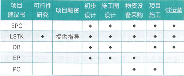 常見(jiàn)的工程總承包方式。工程總承包的主要方式有:設(shè)計(jì)采購(gòu)施工總承包(EPC )、交鑰匙工程總承包 (LSTK )、設(shè)計(jì)建造工程總承包(DB )、設(shè)計(jì)采購(gòu)總承包 (EP )、采購(gòu)施工總承包(PC )。不同的承包方式,參與項(xiàng)目實(shí)施過(guò)程中的不同環(huán)節(jié)(見(jiàn)表1 )。