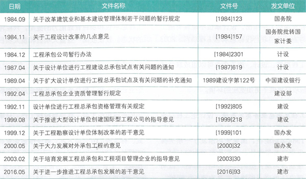 20世紀(jì)80年代,我國(guó)相關(guān)部門(mén)就下發(fā)文件,要求在設(shè)計(jì)、施工企業(yè)組建開(kāi)展工程總承包的試點(diǎn),從國(guó)家頒布的一系列文件中可以看出我國(guó)在推廣工程總承包業(yè)務(wù)方面的幾點(diǎn)變化(見(jiàn)表2 )。
