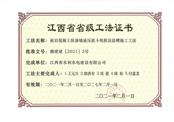 2021年2月1日,江西省住房和城鄉(xiāng)建設(shè)廳文件《關(guān)于公布我省2020年度第二批省級工程建設(shè)工法的通知》(贛建建〔2021〕2號)公布了2021年度第二批省級工程建設(shè)工法評審結(jié)果,其中,公司申報的《小直徑深層攪拌防滲墻二次成墻改進攪拌頭施工工法》、《嵌巖混凝土防滲墻液壓抓斗純抓發(fā)造槽施工工法》審定為“2020年度省級工程建設(shè)工法”。