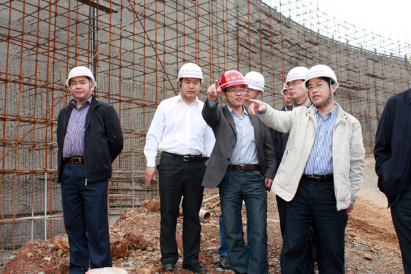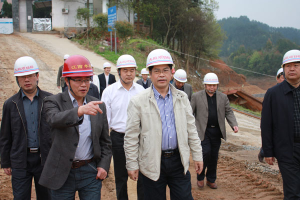 2012年4月6日,江西省水利廳副廳長(zhǎng)廖瑞釗在宜春市副市長(zhǎng)賴國(guó)根的陪同下,深入我公司承建的銅鼓縣大塅水庫(kù)除險(xiǎn)加固工程項(xiàng)目視察指導(dǎo)工作。