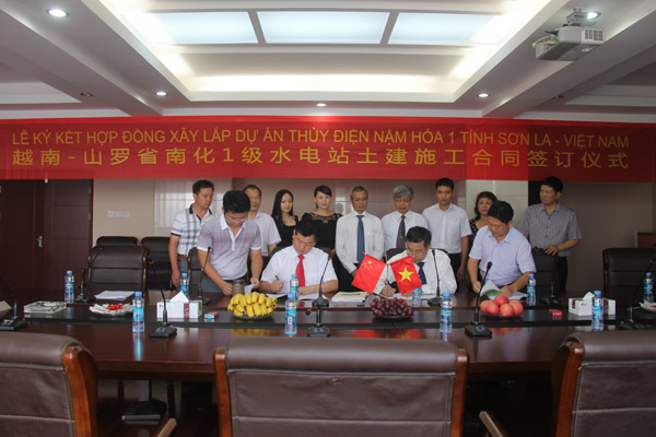 2013年7月22日,越南山羅省南化一級水電樞紐項目建設合同簽字儀式在我公司南昌市總部順利舉行,越南ANPHA水電投資股份公司董事長阮平陽和我公司董事長王元旦分別代表雙方簽署合同。出席簽約儀式的還有越南建設與機電股份公司(MECO)董事長阮玉平、ANPHA水電投資股份公司總經(jīng)理陳重朵,我公司副總經(jīng)理張周平、副總工程師鄒春明、項目經(jīng)理夏愛民等。