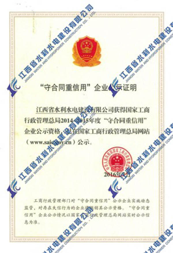 2016年我公司首次榮獲國家工商行政管理總局2014-2015年度“守合同重信用”企業(yè)公示資格?!笆睾贤匦庞谩惫净顒?dòng),是工商部門依托合同行政監(jiān)管職能組織開展的旨在推進(jìn)企業(yè)信用建設(shè)的“守重”企業(yè)公示活動(dòng),是長(zhǎng)期以來我國社會(huì)信用體系建設(shè)的重要組成部分。