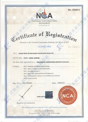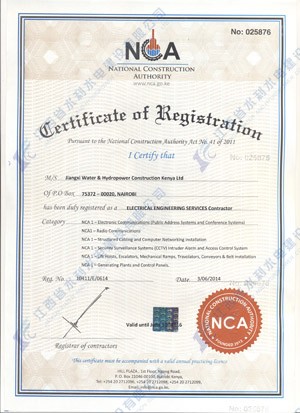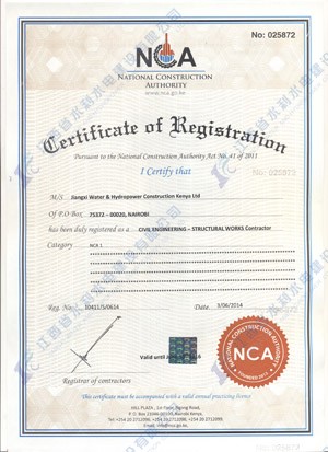 江西省水利水電建設有限公司肯尼亞分公司接到通告后,積極準備相關(guān)資料,憑借公司的技術(shù)實力和肯尼亞市場的良好業(yè)績,最終取得所有六項的一級證書。其中包括:水利施工一級,公路工程施工一級,房屋建筑工程施工一級,結(jié)構(gòu)施工一級,電力工程施工一級和機電工程施工一級,有力地提升公司的品牌影響,提升了公司資信競爭力,為公司在肯尼亞各項工作的全面深入開展創(chuàng)造了積極有利的條件。