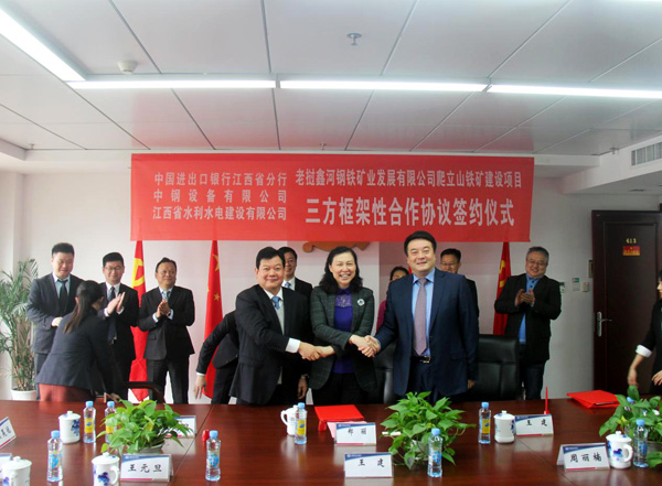 12月29日上午,在江西省商務(wù)廳副廳長方向軍、外經(jīng)處處長王健的見證下,公司與中國進(jìn)出口銀行江西省分行和中鋼設(shè)備有限公司就老撾鑫河鋼鐵礦業(yè)發(fā)展有限公司爬立山鐵礦建設(shè)項目正式簽訂三方框架性合作協(xié)議。中國進(jìn)出口銀行江西省分行行長鄭麗、中鋼設(shè)備有限公司總經(jīng)理王建、公司董事長王元旦、海外公司總經(jīng)理黃鄭民等出席簽約儀式。