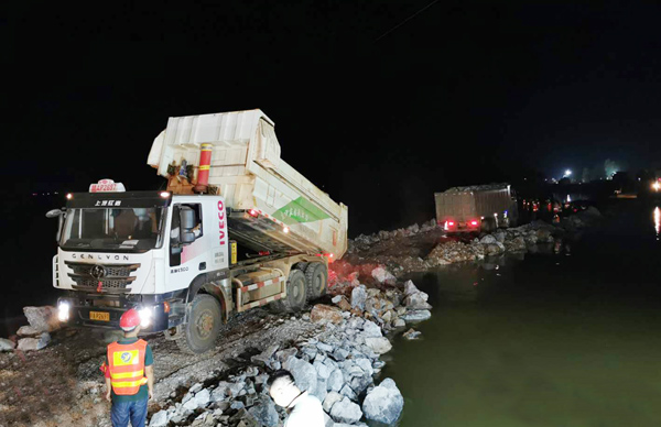 7月13日下午,公司完成封堵工作技術(shù)測量和封堵工作技術(shù)方案制定,7月13日晚上,搶險(xiǎn)技術(shù)、施工人員及設(shè)備陸續(xù)進(jìn)場,并調(diào)配塊石、砂礫石等各類材料進(jìn)場。決口封堵采取南北兩岸同時(shí)進(jìn)占方式施工, 7月14日中午14時(shí)開始進(jìn)占施工,經(jīng)過兩天兩夜連續(xù)55個(gè)小時(shí)施工作業(yè),于7月16日晚上21時(shí)43分,完成決口合攏,比預(yù)計(jì)完工時(shí)間提前50小時(shí)。